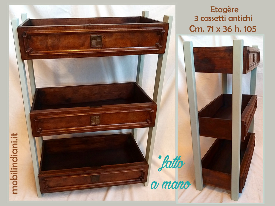 Mobile artigianale, realizzato con 3 cassetti antichi. Cm..71x36 h.105