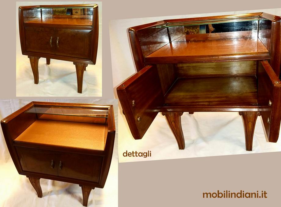 Mobiletto anni '50 originale. Design italiano. Realizzato in radica di noce. gambe intagliate in noce massello. Maniglie in ottone, piano in vetro rosa antico + piano rialzato (più piccolo) in vetro trasparente + specchio tra i due piani (vedi foto) Struttura sana e robusta, vetri in ottime condizioni. Sullo specchio sono presenti leggeri segni del tempo. Cm. 60x38 h.68 NO SPEDIZIONE - RITIRO PRESSO NS. SEDE COSTO ZERO. Per info chiedi su WhatsApp o mail: info@mobilindiani.it